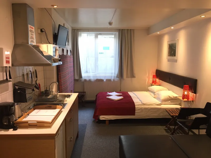 A bright studio with a kitchenette, dining area, and private bathroom. Ideal for solo travelers or couples. Includes Wi-Fi, towels, satellite TV, and regular cleaning. Pets not allowed